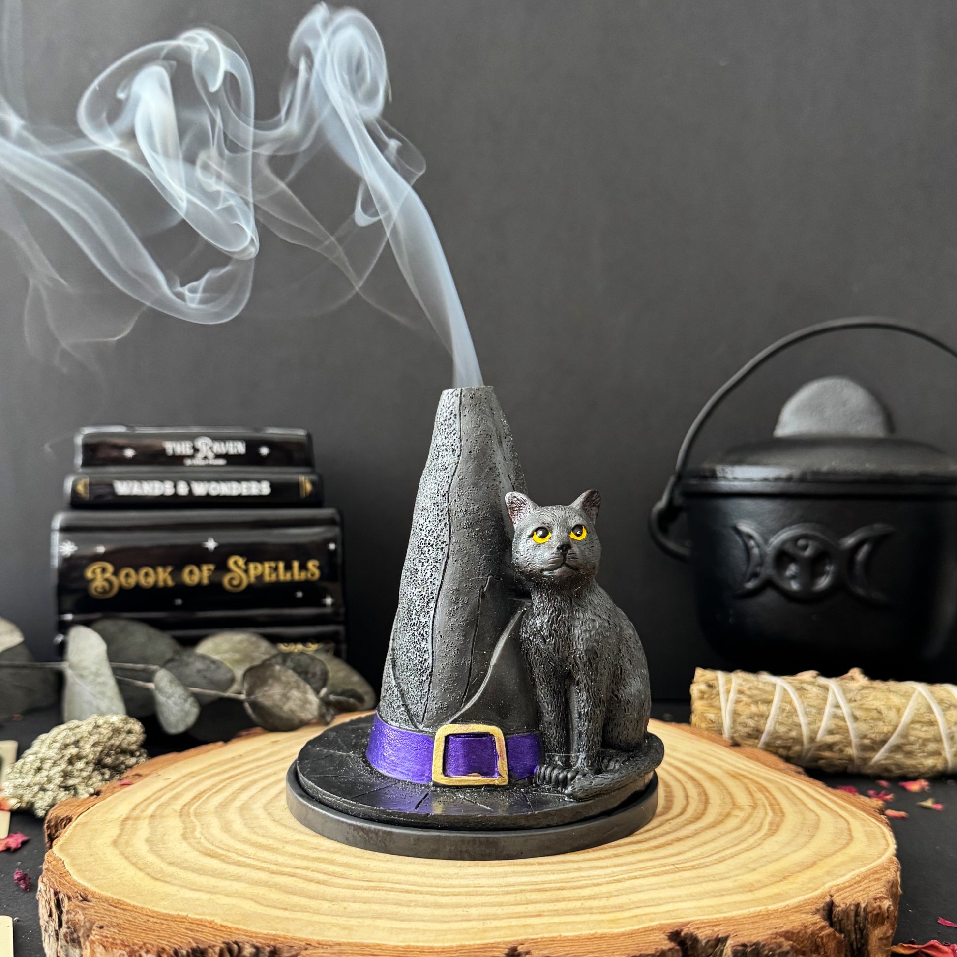 Un quemador brujil demasiado místico y bonito para tu altar. Observa como el humo de tu incienso en cono preferido sube por el sombrero de bruja haciendo del ambiente algo verdaderamente mágico.