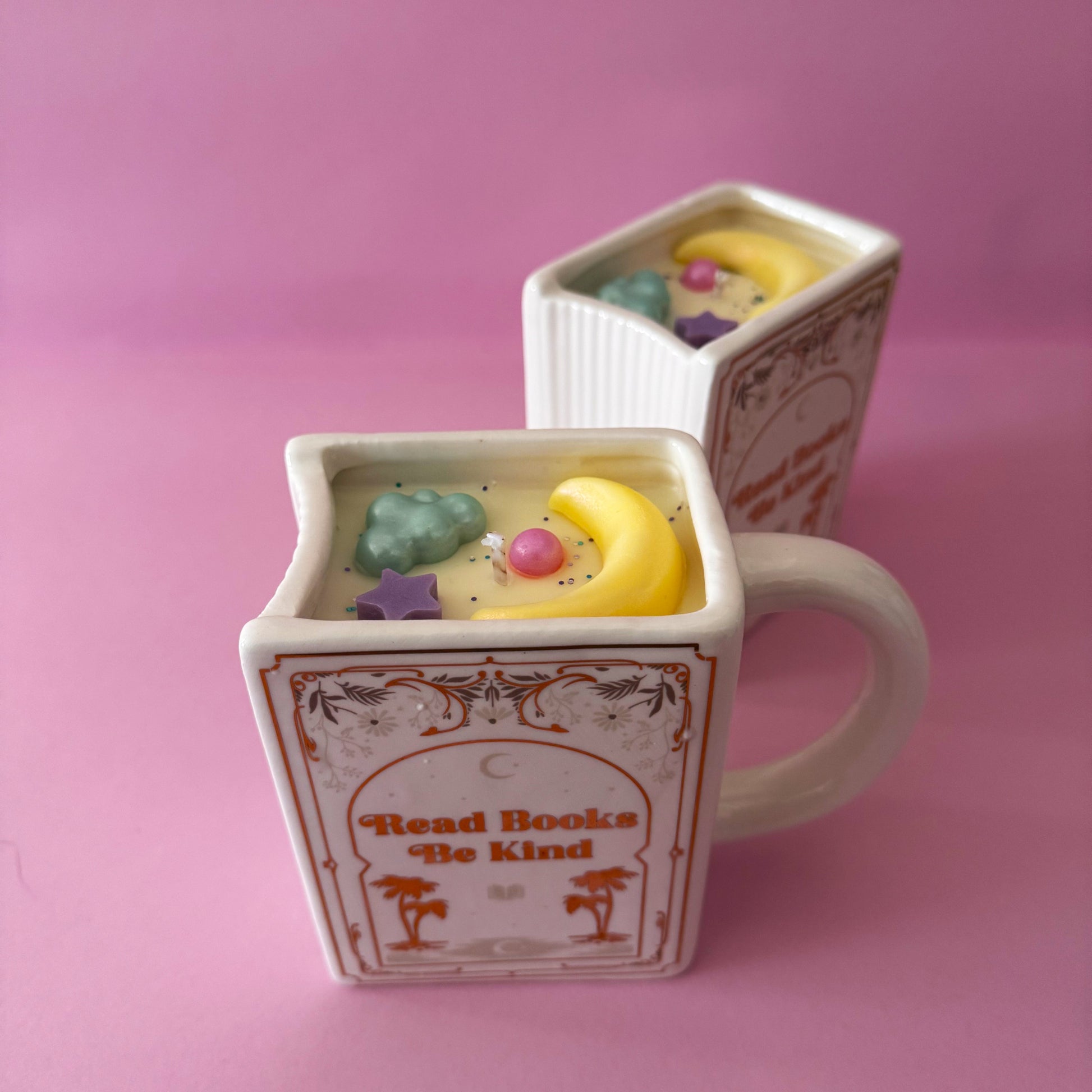 Literalmente hice esta vela pensando en Sailor Moon, esta sacada como de un cuento de hadas. Con aroma a jazmín que llena tu espacio de calma y de la sensación de que puedes lograrlo todo. La taza tiene forma de libro lo cual la hace bastante original y me encanta la frase que tiene, "se amable y lee libros"